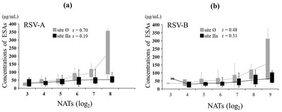 Relationship between NATs and ESAs in maternal blood. In total, 87 MB samples were evaluated for ESAs. The graph is shown as a box plot, showing the range of the 1st and 3rd quartiles as well as the maximum and minimum values. The polygonal line represents the average ESA levels at each NAT. (a) Relationship between the levels of ESAs specific to sites Ø and IIa and NATs against RSV type A in MB. (b) Relationship between the levels of ESA specific to sites Ø and IIa and NATs against RSV type B in MB. Pearson’s product-moment correlation.