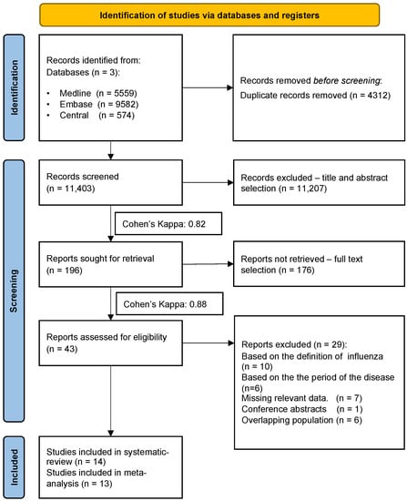 The systematic search yielded 10,450 records. After the duplication removal process, 6229 records remained. All records were checked by title and abstract, and 195 by full text. After overlapping populations were excluded, 14 articles [8,29,30,31,32,33,34,35,36,37,38,39,40] were included in the qualitative and quantitative synthesis. The selection process and Cohen’s kappas are shown in Figure 1.