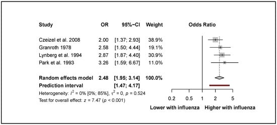 Four eligible articles [34,35,36,38] reported on neural tube defects (NTDs). Our results highlighted that first-trimester maternal influenza infection increased the odds of developing NTDs (OR: 2.48, CI: 1.95–3.14; I2 = 0%, CI: 0–85%; Figure 2).