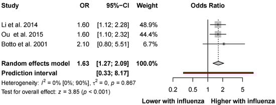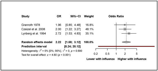 Pooled results from three articles [34,35,36] showed that influenza was associated with more than two times increased odds for the development of spina bifida (OR: 2.22, CI: 1.58–3.12; I2 = 0%, CI: 0–90%; Figure 3).