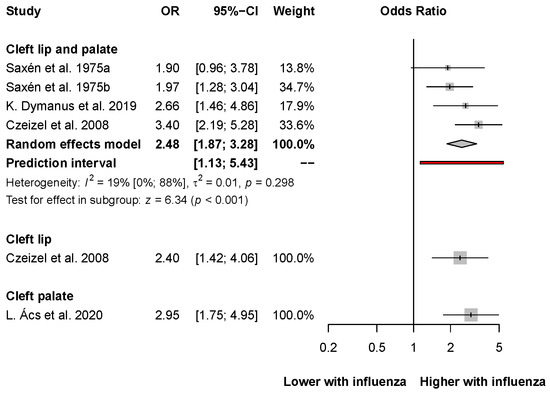 The association between first-trimester maternal influenza infection and cleft lip and palate was reported in four articles [34,39,40,41]. Overall results showed an almost 2.5-fold increase in the development of cleft lip and palate (OR: 2.48, CI: 1.87–3.28; I2 = 19%, CI: 0–88%; Figure 4). Also, Czeizel et al. found an association between the assessed risk factor and cleft lip (OR: 2.40, CI: 1.42–4.06). Moreover, L. Ács et al. found an even stronger association between the assessed exposure and cleft palate (OR: 2.95, CI: 1.75–4.95).