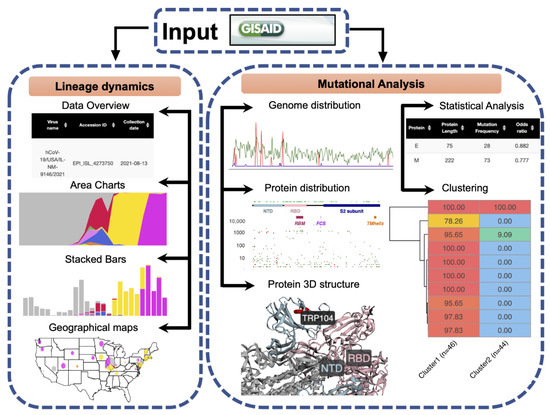 In part to address this problem, several web-based tools have been developed to facilitate the study of SARS-CoV-2 spatiotemporal dynamics, mutational frequency, and/or three-dimensional (3D) protein structures [19,20,21,22]. Though useful for gaining broad insights, these applications are often limited to the analysis of predetermined datasets with minimal user control, such as COVIDCG [23], outbreak info [24], covariants [25], 2019nCoVR [26], CoV-GLUE [27], and COG-UK [28]. However, even tools that allow the processing of user-defined data often accept a limited number of sequencing data such as covdb (limit = 100) [29], coronApp [30] (limit ~100 MB or ~3500), and VirusViz (limit = 50) [31]. In addition to the lack of options for large-scale data analysis, these tools have limited analytical features for the multilevel analysis and visualization of SARS-CoV-2 lineages and their mutations (e.g., spatiotemporal visualization of lineages, linear or 3D visualizations of mutations in the context of proteins and genomes).
