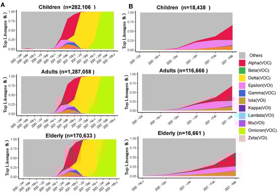 Area plots reflecting (different colors represent variants of concern see legend for details) the relative abundance of variants of concern and variants of interest collected in the USA over time. (A) Frequency of indicated VOCs and VOIs over time in specimens collected between January 2020 and May 2022 in the USA (n = 1,739,797 sequences from GISAID as of 31 May 2022). (B) Frequency of indicated VOCs and VOIs over time in specimens collected between November 2020 and March 2021. Specimens were divided into three age groups: children (up to 18 years), adults (18–64 years), and the elderly (65 years or more). The number of sequences per age group is indicated above each plot. Each subset of genomes was processed separately using the ViralVar “Lineage Dynamics” module.