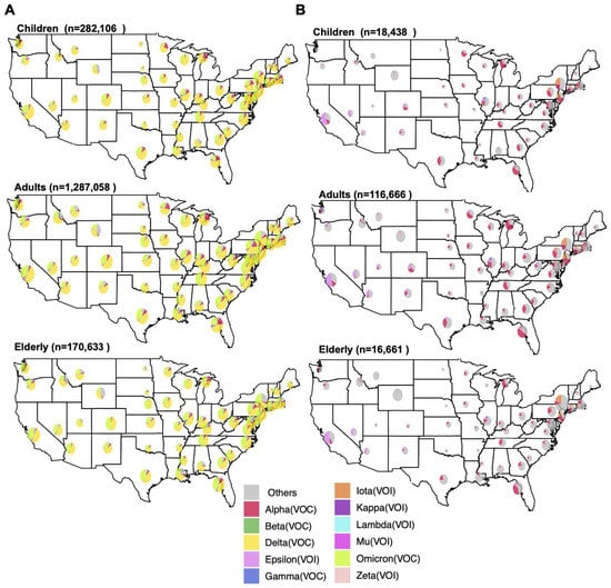 Distribution of SARS-CoV-2 variants of concern and interest by US state. Pie charts represent the proportion of SARS-CoV-2 VOIs and VOCs in each US state as reported to GISAID (as of 31 May 2022) (A) between January 2020 and May 2022 and (B) between November 2020 and March 2021. Specimens were divided into three age groups: children (up to 18 years), adults (18–64 years), and the elderly (65 years or more). The number of sequences per age group is indicated above each plot. The size of pie charts represents the relative frequency of sequenced data in each state. Each subset of genomes was visualized separately using the ViralVar “Geographical Map” feature.