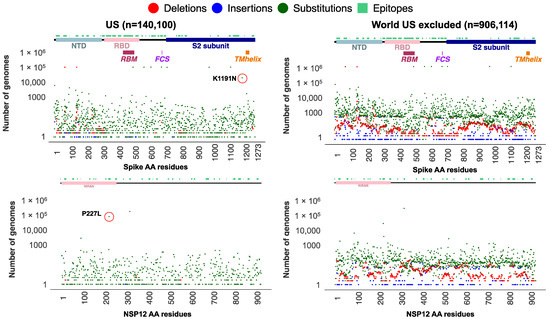 Absolute frequency of mutations in SARS-CoV-2 Spike and NSP12 among Alpha VOCs. SARS-CoV-2 genome data for all sequences assigned to an Alpha variant lineage (B.1.1.7 and Q.*) from the USA (n = 140,100) and rest of the world (n = 906,114, the USA cases excluded) were retrieved from GISAID as of 31 May 2022. Plots represent the absolute frequency of mutations at each amino acid position across Spike (top) and NSP12 (bottom) in sequences from the USA (left) and rest of the world (right). Deletions (red), insertions (blue), and substitutions (green) are plotted in different colors at each position. Boundaries for protein domains of Spike and NSP12 proteins were obtained from [16,17]. Predicted B-cell epitopes are highlighted above in teal, as predicted by [36]. Each subset of genomes was visualized separately using the ViralVar “Protein Distribution” feature.