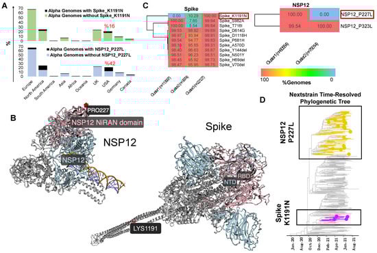 We subset the USA data explained earlier (n = 1,739,797 SARS-CoV-2 sequences) to only include genomes assigned to the Alpha lineage (n = 140,100). Additionally, genomes assigned to the Alpha lineage collected from the entire world (n = 906,114 excluding the USA) were retrieved from the GISAID as of 31 May 2022. Using the ViralVar “Mutational Analysis” module, the mutation profile for the Alpha VOC in the USA was compared to specimens from other countries. All ages were grouped together for this analysis due to the relatively small sample size of the under 18 and over 65 populations compared to adults in this dataset. Using the “Protein Distribution” tab, we visualized the mutational frequency in the Alpha VOC sequences at sites across Spike and NSP12 in both the USA and in the rest of the world (Figure 4). Whereas the defining mutations of the Alpha VOC were universally present, a distinct subset of mutations were more prevalent in the USA, specifically the Spike mutation K1191N and the NSP12 mutation P227L. To further investigate these mutations, all genomes containing Spike K1191N (n = 51,713) and NSP12 P227L (n = 190,869) mutations were retrieved from the GISAID and uploaded into ViralVar. A majority of genomes with the Spike K1191N mutation were in the Alpha variant genomes (80.4%, 41,558 of 51,713 genomes), of which the vast majority came from the USA (93.5%, 38,837 of 41,558 genomes) (Figure 5A, top). Similarly, 169,314 genomes with the NSP12 P227L mutation were classified as Alpha variants (88.7%), of which 104,435 genomes were collected in the USA (61.6%) (Figure 5A, bottom).