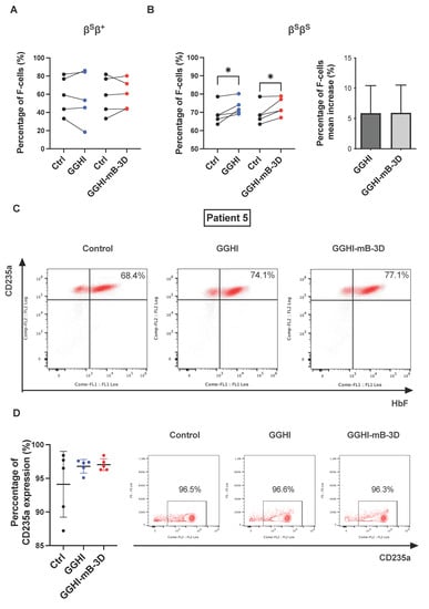 Increased production of F-cells in βSβS SCD CD34+ cells: (A) Before-and-after plot showing F-cell percentages before and after transduction of βSβ+ SCD CD34+ cells with GGHI (p = 0.746, n = 5, paired two-tailed t-test) and GGHI-mB-3D (p = 0.758, n = 5, paired two-tailed t-test) LVs at MOI 100. (B) Before-and-after plot showing F-cell percentages before and after transduction of βSβS SCD CD34+ cells with GGHI (p = 0.038, n = 5, paired two-tailed t-test) and GGHI-mB-3D (p = 0.046, n = 5, paired two-tailed t-test) LVs at MOI 100 (left panel), and bar chart showing the percentage of F-cell mean increase (p = 0.983, n = 5, unpaired two-tailed t-test)(right panel). (C) Representative flow cytometry profiles showing F-cell percentages in βSβS Patient 5. (D) CD235a expression at the end of in vitro differentiation (days 20–21) in the βSβS patient cohort. Mean percentage of CD235a expression was above 90%; specifically, 94.12 ± 4.89, 96.80 ± 1.02, and 97.04 ± 0.88 in mock-transduced, GGHI-transduced, and GGHI-mB-3D-transduced samples, respectively (left panel). No statistical differences were observed between mock-transduced, and GGHI- and GGHI-mB-3D-transduced samples (p = 0.27 and p = 0.22, respectively, n = 5, unpaired two-tailed t-test). Representative flow cytometry profiles of CD235a expression in Patient 5 (right panel). Each dot corresponds to each patient. Error bars represent ±SD, * p ≤ 0.05.
