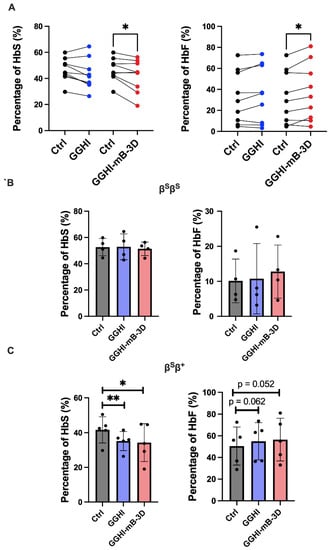 Due to the HU treatment received by all patients, and hence, to elevated levels in the majority of patients, reliable anti-sickling tests, as previously demonstrated by Urbinati et al. [], could not be performed. Therefore, in order to demonstrate a potential phenotype improvement following transduction with our lentiviral vectors, we performed Hb electrophoresis/CE-HPLC, aiming to document an HbS decrease, and a concomitant HbF increase, following transduction. Repeated-measures ANOVA showed significant HbS differences between treatments (F(2,24) = 3.74, p = 0.046) and across all patients. Overall, and as it can be seen in Figure 3A (left panel), transduction with GGHI-mB-3D LV only, led to a marked decrease in HbS. Specifically, the mean HbS percentage reached 41.9 ± 12.3%, compared to 46.6 ± 8.9% observed in mock-transduced cells (p = 0.022, n = 9), with a mean difference of −4.66 ± 4.94 (Figure S3A), The above decrease was followed by a concomitant HbF increase (Figure 3A, right panel), reaching 37 ± 27% compared to 33 ± 25% in mock-transduced cells (p = 0.023, n = 9), with a mean difference of 4.47 ± 4.76 (Figure S3A). Transduction with GGHI LV led to a marginal effect, with the mean HbS and HbF percentages post transduction reaching 43.1 ± 11.8% (p = 0.053, n = 9) and 35.3 ± 27% (p = 0.091, n = 9), respectively.