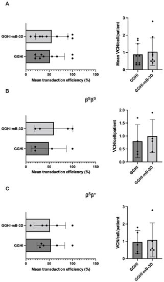Transduction efficiency and VCN in the βSβS and βSβ+ patient cohorts are shown in Figure 4B,C and Table 2 and Table 3. More specifically, transduction efficiency achieved by GGHI and GGHI-mB-3D LVs in βSβS patients was 49 ± 38% and 60 ± 41%, respectively (p = 0.71, n = 4, unpaired two-tailed t-test) (Figure 4B, left panel and Table 2), while mean VCN/cell was 0.8 ± 0.64 (median 0.6, with a range 0.3–1.7) for GGHI and 1 ± 0.66 (median 0.85, with a range 0.4–1.9) for GGHI-mB-3D (p = 0.67, n = 4, unpaired two-tailed t-test) (Figure 4B, right panel and Table 2). Transduction efficiency achieved by GGHI and GGHI-mB-3D LVs in the βSβ+ cohort reached 54 ± 30% and 51 ± 34%, respectively (p = 0.91, n = 5, unpaired two-tailed t-test) (Figure 4C, left panel and Table 3), while mean VCN/cell was 0.96 ± 0.67 (median 0.8, with a range 0.3–1.8) and 1.1 ± 0.98 (median 0.6, with a range 0.5–2.8), respectively (p = 0.83, n = 5, unpaired two-tailed t-test) (Figure 4C, right panel and Table 3).
