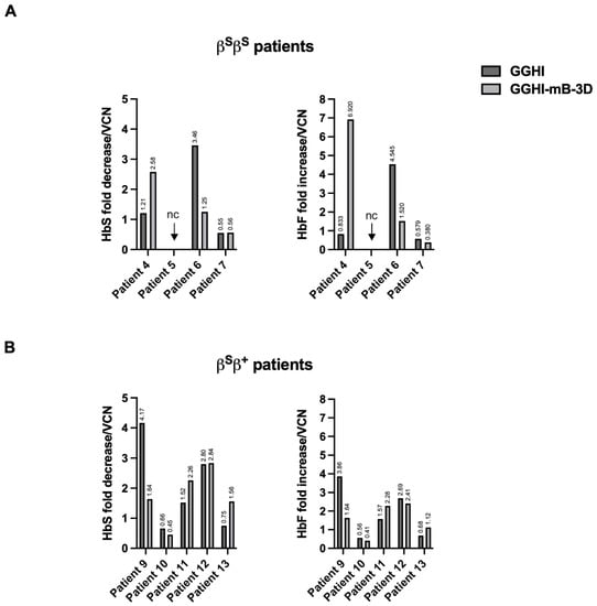 HbF and HbS fold difference in βSβS and βSβ+ SCD patients, post transduction: (A) Bar chart showing HbS fold decrease (left) and HbF fold increase (right) in βSβS patients following normalization to mean VCN/cell/patient; nc, not conducted. (B) Bar chart showing HbS fold decrease (left) and HbF fold increase (right) in βSβ+ patients following normalization to mean VCN/cell/patient.