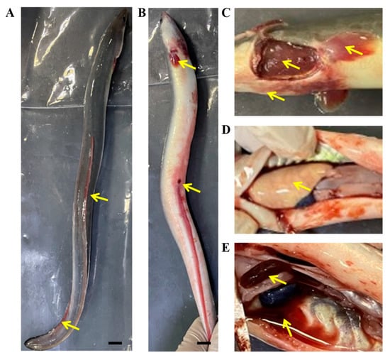 Clinical symptoms of hemorrhagic disease in the naturally diseased American eels. (A) Congestion of the dorsal fin. (B) Congestion of the pectoral fin and anal fin, and red abdomen and swollen anus. (C) Ischemic gill and mandibular hyperemia. (D) Ischemic liver. (E) Enlarged and congested spleen, abdominal hemorrhage. Yellow arrows show the different tissues with clinical symptoms. Scale bar = 1 cm.