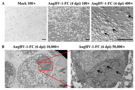 AngHV-1-FC infection in EES cells. (A) CPE induced by AngHV-1-FC in EES cells. EES cells were infected with AngHV-1-FC at 4 dpi, and the swollen cells and syncytium were found in 400× magnification. The morphology was observed under light microscope. Black arrows represent the syncytiums, and scale bar = 200 µm. (B) The cells with CPE under electron microscope. Numerous concentric circular viral nucleocapsid were observed in the nuclear under electron microscope with 50,000× magnification. Black arrows represent the viral nucleocapsids, red frame represent the detail view, and scale bar = 2 µm or 500 nm.