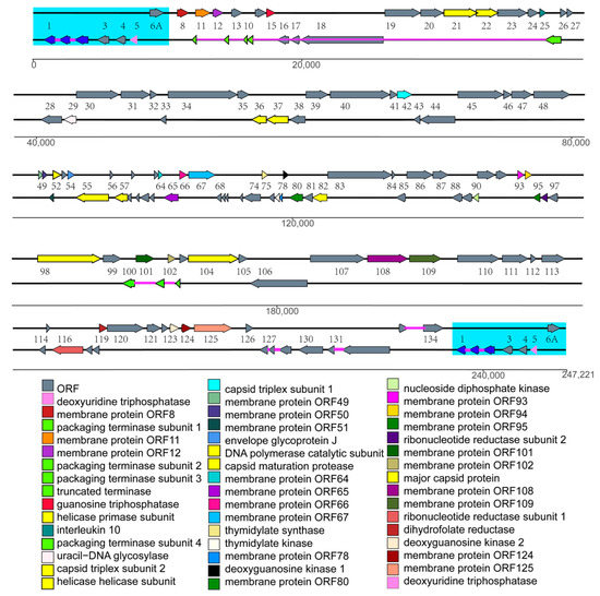 Map of the genome structure of AngHV-1-FC with the protein annotations. The predicated ORFs are indicated by colored arrows and the directions of arrows represent transcription initiation direction of them. ORFs are depicted as color-shaded arrows, with names (lacking the ORF prefix) between the two strands. Introns connecting spliced ORFs are shown as narrow purple bars according to the transcriptome information of the reference genome [15]. The 12 core ORFs conserved in all Alloherpesviridae isolates are presented in light green or yellow arrow. The other identical ORFs among three virus isolates FC, FJ and TW are presented in different colors with different functions and the ORFs with unknown functions are presented in grey. The name of ORFs with known functions are shown in the list below the map. The TR is shown in cyan.