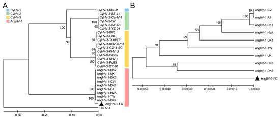 Phylogenetic trees of AngHV-1-FC. (A) The phylogenetic tree of concatenated 3 core gene amino acid sequences (DNA polymerase, DNA helicase, and terminase genes from AngHV-1, Cyprinivirus and RaHV-1 genomes). The tree was constructed by the neighbor-joining method with 1000 bootstrap replicates. (B) The phylogenetic tree based on whole genome sequences of AngHV-1 isolates. The tree was constructed by the UPGMA method. Only values greater than 50% are shown. The AngHV-1-FC is marked by a black triangle.