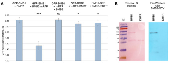 Analysis of interaction between BMB1 and BMB2. (A) FRET-FLIM analysis of protein interaction in cells of N. benthamiana leaves agroinfiltrated for expression of BMB1 and BMB2. The bar graphs represent average fluorescence lifetimes (ns), error bars indicate the standard deviation. Numbers of independent measurements (N) were as follows: GFP-BMB1 + BMB2, 283; GFP-BMB1 + BMB2-mRFP, 463; GFP-BMB1 + mRFP + BMB2, 134; GFP-BMB1 + mRFP-BMB2, 133; BMB1-GFP + BMB2-mRFP, 172. Above the bars, the significance of difference from the data for GFP-BMB1 + BMB2 is indicated; asterisks indicate a statistically significant difference (***, p < 0.001; *, p < 0.05) according to a Student’s t-test; NS—not statistically significant (p ≥ 0.05). (B) Far-Western analysis of interaction between the bacteria-expressed 6x-His-tagged BMB1 and BMB2-QTY, a BMB2 version lacking hydrophobic membrane-interacting regions. Left, Ponceau S staining of membrane with proteins transferred from a protein gel (BMB1, 43 kDa; DHFR, 25 kDa). Right, detection of BMB2-QTY after incubation of the membrane with a preparation of purified BMB2-QTY. M, molecular weight markers. Sizes of individual protein bands are indicated in kDa.