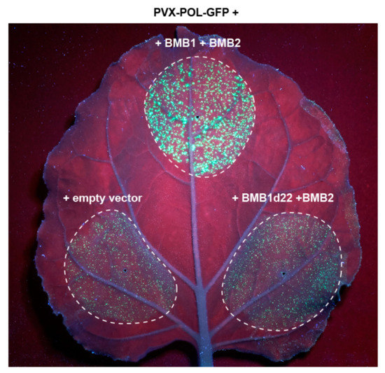 Analysis of functional competence of BMB1d22. Complementation of cell-to-cell movement of PVX-POL-GFP by combinations of BMB1 with BMB2, BMB1d22 and empty vector (negative control) is shown. The leaf was imaged under UV light at 5 d.p.a. Dashed lines encircle infiltrated areas.