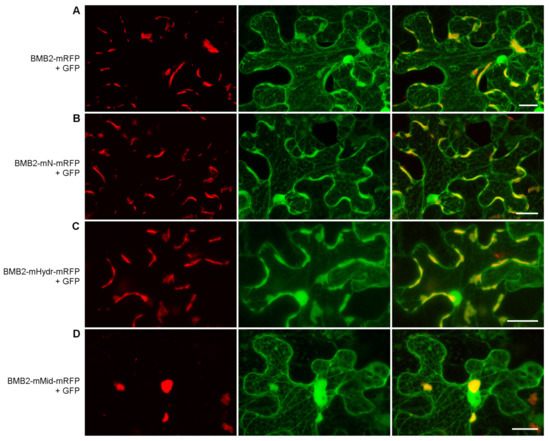 Subcellular localization of BMB2 mutants BMB2-mN (B), BMB2-mHydr (C) and BMB2-mMid (D). The mutants and the wild type protein (A) taken as a control were coexpressed with GFP to visualize cells. Left images, mRFP channel. Center images, GFP channel. Right images, superposition of images for GFP and mRFP channels. All images are reconstructed from Z-series of optical sections. Scale bar, 20 μm.