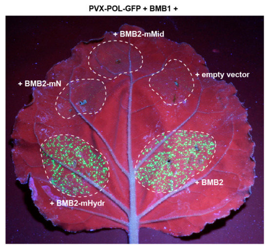 Next, the functional competence of BMB2 mutants in virus cell-to-cell transport was analyzed in the PVX-POL-GFP complementation test. Leaves were agroinfiltrated for coexpression of PVX-POL-GFP with BMB1 and either wt BMB2, or the individual BMB2 mutants. Of three mutants tested, only BMB2-Hydr retained the functional ability of the wild-type protein in virus transport, whereas BMB2-mN and BMB2-mMid exhibited no complementation of PVX-POL-GFP cell-to-cell movement (Figure 6).