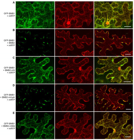 Analysis of the ability of BMB2 mutants to direct GFP-BMB1 to PAMBs. GFP-BMB1 was coexpressed with mRFP (used to visualize the cell shape and the nuclei) and BMB2 mutants (C–E), as indicated on the left. Coexpression with the wild type BMB2 (B) was used as a control. The coexpression of GFP-BMB1 with mRFP (A) represented a negative control. Left images, GFP channel. Center images, mRFP channel. Right images, superposition of images for GFP and mRFP channels. Scale bar, 20 μm.