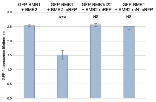 FRET-FLIM analysis of role of the BMB1 C-terminal region and the BMB2 N-terminal region in the interaction between BMB1 and BMB2. Measurements were carried out in cells of N. benthamiana leaves agroinfiltrated for expression of the indicated pairs of proteins. The bars represent the average GFP fluorescence lifetimes (ns), error bars indicate the standard deviation. Number of independent measurements (N) was 48 for each tested protein combination. Above the bars, the significance of difference from the data for GFP-BMB1 + BMB2 is indicated; asterisks indicate a statistically significant difference (***, p < 0.001) according to a Student’s t-test; NS—not statistically significant (p ≥ 0.05).