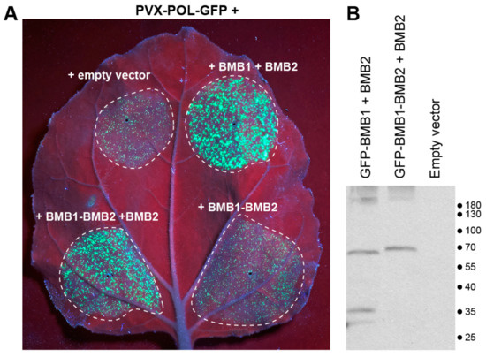 Analysis of properties of the BMB1-BMB2 fusion protein. (A). Analysis of functional competence of BMB1-BMB2 in PVX-POL-GFP complementation test. Complementation of cell-to-cell movement of PVX-POL-GFP by combinations of BMB1 with BMB2 (positive control), BMB1-BMB2, BMB1-BMB2 + BMB2 and empty vector (negative control) is shown. The leaf was imaged under UV light at 5 d.p.a. Dashed lines encircle infiltrated areas. (B). Western blot analysis of GFP-BMB1-BMB2 with GFP-specific antibodies in N. benthamiana leaves agroinfiltrated for coexpression of GFP-BMB1-BMB2 and BMB2. In controls, leaves were agroinfiltrated for expression of either GFP-BMB1 and BMB2, or an empty vector. Positions of molecular weight markers (in kDa) are shown on the right.