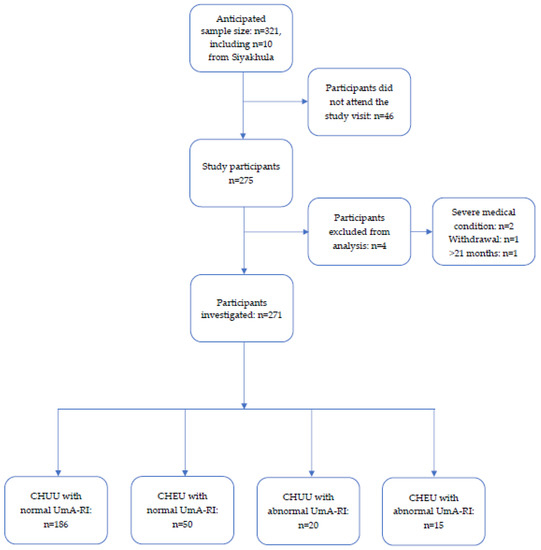 The sample size calculation using power analysis indicated that a sample size of 280 was required overall, with a split of 80/20% for CHEU and CHUU. The anticipated sample from the Umbiflow International cohort was 311; however, 46 participants did not attend their study visit, meaning 265 participants were enrolled. Four participants were subsequently excluded either because of age above the set upper limit of 21 months, acute child illness at the study visit or parental choice to not complete the study visit; therefore, this study included 261 participants from the Umbiflow International cohort and an additional 10 participants from the Siyakhula study. The sample size per group for the infant follow-ups was as follows: CHUU with normal UmA-RI: n = 186; CHEU with normal UmA-RI: n = 50; CHUU with abnormal UmA-RI: n = 20; and CHEU with abnormal UmA-RI: n = 15 (Figure 1).