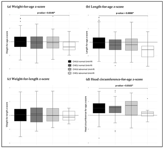 The box plots showing the significant differences for weight-for-age z-score, length-for-age z-score, weight-for-length z-score and HC-for-age z-score between the study groups. The z-scores were computed using World Health Organization (WHO) Anthro software of 2011, using corrected age for premature children. (a) WAZ for CHEU abnormal UmA-RI is below the median line and lower than the three groups; (b) LAZ for CHEU abnormal UmA-RI is very far below the median and lower than the three groups; (c) WLZ for CHEU abnormal UmA-RI is the only group below the median line; (d) HCZ for CHEU abnormal UmA-RI is low compared to their counterparts in the different groups. Abbreviations: CHEU: children who are HIV-exposed-uninfected; CHUU: children who are HIV-unexposed-uninfected; UmA-RI: umbilical artery resistance index; WAZ: weight-for-age z-score; LAZ: length-for-age z-score; HCZ: head circumference z-score; HC: head circumference.