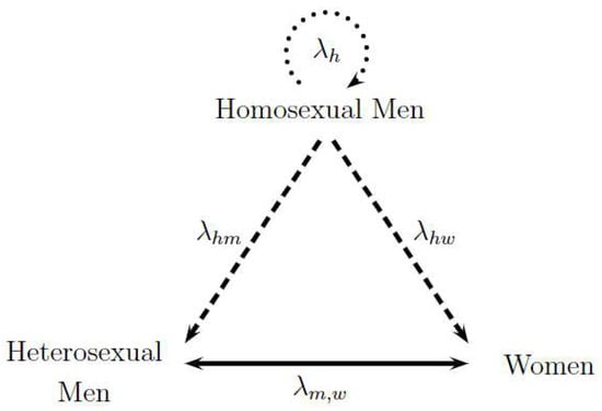 With regard to sexual contact between homosexual men, heterosexual men and women [13,14] say: “There exist individuals that change their sexual behavior depending on the situation or at different stages in their life. A possibly common and transient example of situational sexuality is the person who self-identifies as heterosexual, but will sexually interact with a member of the same sex when lacking other opportunities. Less transient but also possibly common, a person who self-identifies as gay or lesbian (either at the time, or later) may sexually interact with a member of the opposite sex if a same-sex relationship seems unfeasible”. Thus, in our model, we consider bisexual contact.