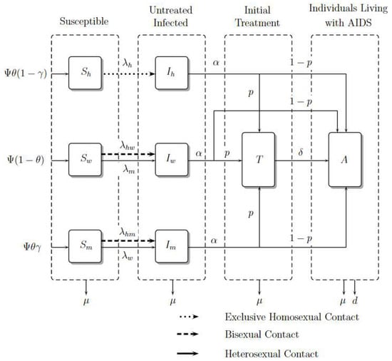 Initially treated individuals and individuals living with AIDS receiving ART are disregarded from the transmission because their viral load is negligible. In Figure 1, we assume that susceptible homosexual men only become infected by infected homosexual men, and susceptible women (or men) become infected by infected men (or women) or infected homosexual men. This means that susceptible homosexual men select their partner randomly from the infected homosexual population, while women or men select their partners randomly from the infected heterosexual or infected homosexual population [15].