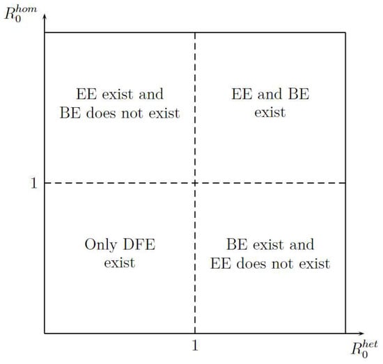 Figure 3 shows the existence of equilibrium points, such as Disease-Free Equilibrium (DFE), Boundary Equilibrium (BE), and Endemic equilibrium (EE) in function of and . The figure shows two important aspects. First, the DFE is the only stationary point that exists when or are less than one; it gives an idea of how stability can be. Second, for existence of EE, the is more important that because when is greater than 1 the EE exit, whereas when is greater than 1 is necessary that will be greater than 1.