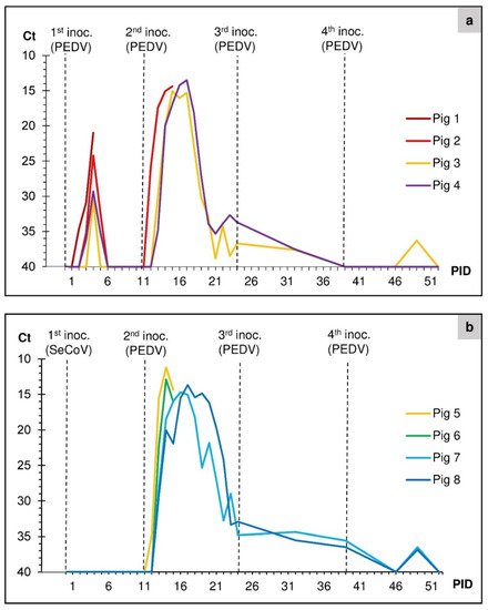 The pigs were RT-qPCR positive for PEDV with intermittent shedding up to PID 49 (for group 2 corresponding to 38 days after PEDV infection). However, we do not know if the long shedding period was due to the re-inoculations and if the third and fourth inoculations had any effect on the duration of virus shedding. Long periods of viral RNA shedding have been described earlier with RT-qPCR detection of the virus for up to 42 days after infection but with the shedding of infectious virus for only 14–16 days [28]. Even longer durations of positive RT-qPCR results, for up to ten weeks after infection of pigs in a field setting, were seen from tests of oral fluid samples [29].