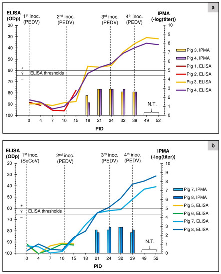 Prior to inoculation, the eight pigs all tested negative for antibodies against PEDV and TGEV using ELISA. Measurements of antibodies specific for PEDV detected using the “in-house” PEDV blocking ELISA and IPMA are shown in Figure 2a,b. No anti-PEDV response was apparent in the pigs in group 1 prior to the 2nd inoculation (on PID 11). However, in both the ELISA and IPMA, seroconversion against PEDV in these pigs was detected from PID 18 (7 days after the re-inoculation) (Figure 2a). Thus, the 3rd and 4th inoculations were performed in seropositive animals, and this may account for the lack of further episodes of high virus excretion (Figure 1a).