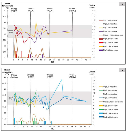 Overall, only a few clinical signs were observed in the two groups of pigs following inoculation with PEDV and mainly as intermittent diarrhea (clinical score 2) or thin/non-formed feces (clinical score 1) (Figure 3). In group 1 (Figure 3a), after the first inoculation on PID 0, all pigs developed diarrhea from PID 1 or 2 for a duration of 1–2 days. Gastrointestinal signs in the form of thin feces were observed again in the pen around the time of the second inoculation on PID 11 and for up to ten days afterward. A single animal (pig 2) was anorexic (clinical score 2) on PID 5. Still, no other changes in behavior/appearance were observed within this group. Rectal temperatures were mainly within the normal range (38.7–39.8 °C) [26] throughout the experiment, with a single measurement outside of this range for pig 3 on PID 15 (40.0 °C).