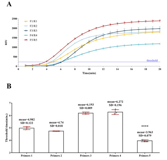 Primer screening. (A) Amplification curves of the positive plasmid samples using different primer sets. (B) Threshold times of the amplifications using different primer sets. SD: standard deviation. Compared with each group, significant differences were indicated with asterisks: ****, p < 0.0001.
