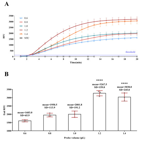 To optimize the probe consumption, four different probe volumes (0.6 μL, 0.9 μL, 1.2 μL, and 1.8 μL) with a concentration of 10 μM were respectively added to the reaction system. All groups were successfully amplified except the NTC group (Figure 3A). When the probe volume was no more than 1.2 μL, the corresponding End-RFU increased with the increase in probe volume, and the End-RFU of 1.4 μL (3038 ± 245.0) was similar to that of 1.2 μL with 3267.5 ± 159.0, p < 0.05 (Figure 3B). Hence, we finally utilized 1.2 μL of the 10 μM probe in the subsequent sensitivity experiments.