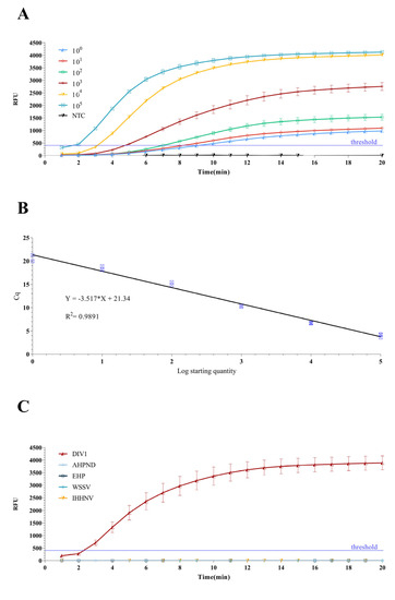 To test the sensitivity, six sets of gradient-diluted DIV1 plasmid samples with concentrations from 1.0 × 105 to 1.0 copies μL−1 and the equivalent volume of ddH2O were used to analyze the DIV1-qPCR, DIV1-qRPA and DIV1-RPA-SYBR Green I assays. Analyzing the amplification curve in the DIV1-qRPA assay, we observed that the six sets were all successfully amplified except for NTC, and all sets reached the detection threshold in 10 min (Figure 4A).