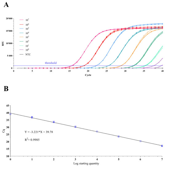 The recombinant plasmid was 434 ng μL−1, equal to 1.0 × 1011 copies μL−1, then diluted serially tenfold from 1.0 × 1011 to 1.0-copies μL−1.