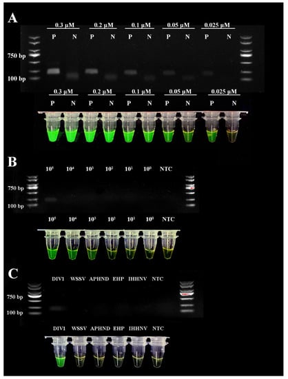 The sensitivity of the DIV1-RPA-SYBR Green I assay was determined by observing the fluorescence results of each tube after the reaction was completed. The results show that reducing the primer concentration indeed affected the detection limit, and the sensitivity of the DIV1-RPA-SYBR Green I assay was still high. When the input template concentration was lower than 1.0 × 103 copies μL−1, there was little difference between the positive and NTC samples to the naked eye under UV light, indicating the LOD of the DIV1-RPA-SYBR Green I assay was 1.0 × 103 copies μL−1 (Figure 6B).