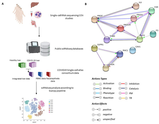 Experimental design and protein–protein interaction network. (A). Public data from single-cell RNA sequencing (scRNA-seq) studies on the human tissues (liver, peripheral blood mononuclear cells (PBMC), and nasal epithelia) were retrieved from the website portal www.COVID-19cellatlas.org accessed on 16 April 2022 and Gene Expression Omnibus (GEO) accession numbers GSE171668 and GSE115469. (B). The PROC interactome was retrieved with the string-db data mining toolkit (https://version-11-0.string-db.org/cgi/network.pl?taskId=lu4XDH7F7cOZ, accessed on 16 April 2022). The sources used for functional interactions were neighborhood, experiments, gene fusion, databases, co-occurrence and co-expression, and visualized by the ‘molecular actions’. The network nodes represent proteins and the edges represent protein–protein associations. The edges indicate the known molecular action of a protein node relative to another protein node. PM: post-translational modification; TR: transcriptional regulation.