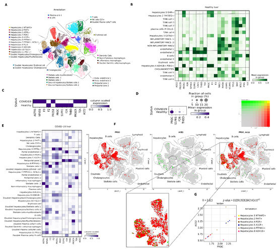 Liver. PC synthesis occurs mainly in hepatocytes, and it is released into the bloodstream as a zymogen [19]. First, we determined the expression of the PROC gene in healthy liver parenchyma and then compared the expression to samples collected from autopsies of patients who died because of severe COVID-19 complications. PROC was expressed throughout the liver parenchyma of healthy individuals, particularly in hepatocyte 4 (ADH1B+/PCK1+), which displayed the highest expression (Figure 2B). ACE2 expression was restricted to cholangiocytes in the healthy liver; the main receptors involved in PC signaling—PROCR, F2R, S1PR1, THBD, and TEK—were detected in endothelial cells (Figure 2B). In liver autopsy samples from patients who died because of COVID-19 complications, PC activation signaling receptors were significantly decreased compared with control as follows: 2.7-fold for S1PR1, 2.5-fold for F2R and 1.7-fold for THBD (p < 0.001), and less than 5% of cells expressed these genes (Table 1; Figure 2C,D). Conversely, liver samples from patients with COVID-19 presented a significant 1.9-fold increase in AGTR1, a 1.8-fold increase in NFKB1, and a 1.2-fold increase in F3 (p < 0.001) (Table 1; Figure 2C). Additionally, there was a significant 2.192-fold decrease in PROC in liver samples from individuals who died from COVID-19 complications (p < 0.001) (Table 1; Figure 2C). The relative number of hepatocytes from patients with COVID-19 expressing PROC was lower (about 5%) than in healthy individuals (about 20%) (Table 1; Figure 2D). The highest expression of PROC occurred in hepatocyte 3 (ATP5L+), followed by hepatocytes 9 (ADH1B+), 5 (A1CF+), and 6 (PTP4A1+) (Figure 2E). ACE2 gene expression was 2.868-fold higher in patients with COVID-19 (p = 0.000) (Table 1), and the expression was no longer restricted to cholangiocytes (as in the healthy liver) but extended to the liver parenchyma. ACE2 was expressed by hepatocytes 9 (ADH1B+), 5 (A1CF+), 6 (PTP4A1+), and 2 (FHIT+) with low PROC co-expression (Figure 2E,F). Moreover, there was a very strong association between ACE2 and PROC gene expression in samples from patients with COVID-19 between the cells that co-expressed these two genes (Figure 2G).