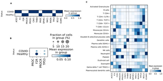 Expression of genes involved in activated protein C (APC) signaling in human peripheral blood mononuclear cells (PBMC) from patients with coronavirus disease 2019 (COVID-19) based on single-cell transcriptomics. (A). Matrix plot showing expression of genes related to APC signaling in patients with COVID-19 versus healthy individuals. (B). Dot plot representation of downregulated genes in patients with COVID-19. (C). Matrix plot showing expression of the main genes related to APC signaling according to cell types.