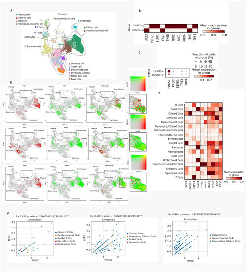 Expression of genes involved in activated protein C (APC) signaling in nasal epithelial cells from patients with coronavirus disease 2019 (COVID-19) based on single-cell transcriptomics. (A). Uniform manifold approximation and projection (UMAP) embedding of nasal epithelial cells via single-cell RNA sequencing (scRNA-Seq) droplet-based single-cell platform grouped into 18 clusters. (B). Matrix plot showing expression of genes related to APC signaling in patients with COVID-19 versus uninfected individuals. (C). Dot plot representation of downregulated genes in patients with COVID-19. (D). Matrix plot showing expression of the main genes related to APC signaling according to cell types retrieved from Nasal epithelial samples. (E). Visualization of co-expression (yellow) by color overlap. PROC (red) is barely co-expressed with ACE2 (green) in ciliated cell clusters. ACE2 (red) is co-expressed with PROS1 (green) in ciliated cell clusters. PROC (red) is co-expressed with PROS1 (green) in ciliated cell clusters. (F). Spearman’s correlation of a subset of cells that expressed PROC, PROS1, and ACE2.