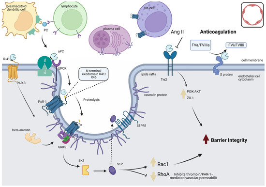 PC activation and signaling in the endothelial cell. When thrombin binds to TM on endothelial cell surfaces, PC is converted to its active form (APC), and EPCR is necessary for optimal PC activation. The co-localization of PAR-1 and EPCR in caveolin-1-rich membrane microdomains specialized in the cell membrane is essential for PAR-1-mediated cytoprotective APC signaling. Furthermore, the heterogeneous expression of PC activation receptors (EPCR, THBD, CAV-1, and PAR-1) in other cell populations suggests that PC activation might occur dynamically by zymogen PC interacting with ‘migratory’ receptors expressed on the surfaces of infiltrating immune cells in the injury site. The anti-inflammatory and anticoagulant actions of APC occur mainly through PAR-1, which, when activated, propagates pro-inflammatory and anti-inflammatory responses according to the protease that cleaved it. PAR-1 is sensitive to proteolysis at its N-terminal exodomain by multiple plasma proteases, including thrombin, APC, plasmin, factor VIIa, factor Xa, and matrix metalloproteases. Cleavage of PAR-1 at the R41/46 sites at the N-terminal exodomain by APC initiates signaling, promoting structural reorganization of the receptor and coupling to the G protein complex (GRK-5) to phosphorylate the intracellular region of PAR-1 and recruitment of β-arrestin 2, which serves as a framework for cytoprotective signaling. This cascade initiates a series of intracellular signaling pathways, including upregulation of SPHK1 activity and, therefore, S1P production, leading to activation of signaling through its S1PR1 receptor, which stimulates a marked increase in Rac1 activation to perform a protective barrier function by stabilizing the endothelial cytoskeleton and inhibiting RhoA signaling. The Tie2 receptor transmembrane domain can initiate downstream signaling pathways and maintain vascular integrity through direct APC binding, which results in increased ZO-1 phosphorylation of Akt via PI3K and ERK inhibition, contributing to increasing the integrity of the barrier. Protein S cofactor-linked APC can intervene at various points during the systemic response to infection. It exerts an antithrombotic effect by inactivating factors Va and VIIIa, limiting thrombin generation. Finally, PAR-3 cleavage by APC can initiate PAR1-dependent cytoprotective signaling in endothelial cells in the presence of EPCR. APC: activated protein C; EPCR: endothelial protein receptor; ERK: extracellular signal-regulated protein kinase; PAR-1: protease-activated receptor 1; PAR-3: protease-activated receptor 3; PC: protein C; PI3K: phosphoinositide 3-kinase; S1P: sphingosine-1-phosphate; SPHK1: sphingosine kinase-1; TH: thrombin; Tie2: transmembrane receptor tyrosine kinase; TM: thrombomodulin.