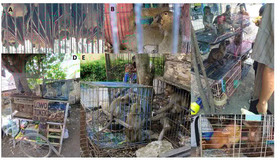 Trade in wild mammals in Java, Indonesia. (A) Indonesian short-nosed fruit bat (Cynopterus titthaecheilus); (B) plantain squirrel (Callosciurus notatus), (C) long-tailed macaque (Macaca fascicularis) and Asian palm civet (Paradoxurus hermaphroditus); (D) long-tailed macaque and giant fruit bat (Pteropus vampyrus); (E) long-tailed macaque; (F) Javan mongoose (Urva javanica).