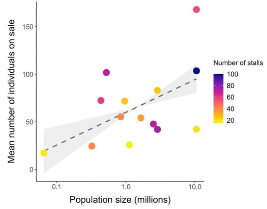 The mean number of individuals offered for sale showed a positive trend related with the human population in the respective city (Estimate = 14.91 ± 4.10, t-value = 3.64, p-value = 0.004) and the number of market stalls selling wildlife (Estimate = 39.54 ± 14.02, t-value = 2.82, p-value = 0.02) (Figure 2). Conversely, no clear trend was found between human population (Estimate = 0.53 ± 0.44, t-value = 1.21, p-value = 0.25) or number of stalls in the market (Estimate = 0.05 ± 1.45, t-value = 0.035, p-value = 0.97) with taxa richness on sale.