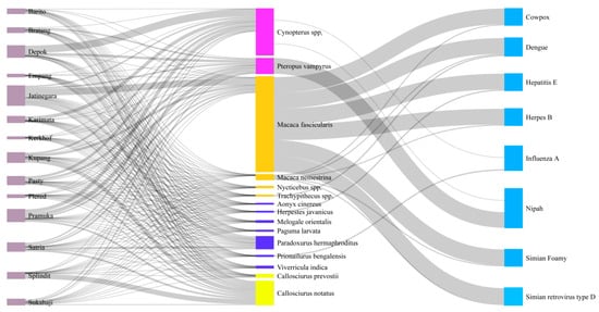 The Sankey network diagram shows that long-tailed macaque is the species with the greatest potential for spreading diseases (Figure 3), since it is both a host for a large number of viruses and the most traded species, being sold in large quantities in 13 (93%) out of 14 surveyed markets.