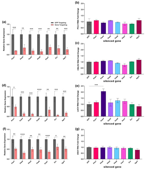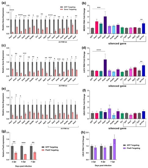 - Schnettler, E.; Donald, C.L.; Human, S.; Watson, M.; Siu, R.W.C.; McFarlane, M.; Fazakerley, J.K.; Kohl, A.; Fragkoudis, R. Knockdown of piRNA pathway proteins results in enhanced Semliki Forest virus production in mosquito cells. J. Gen. Virol. 2013, 94, 1680–1689. [Google Scholar] [CrossRef]
