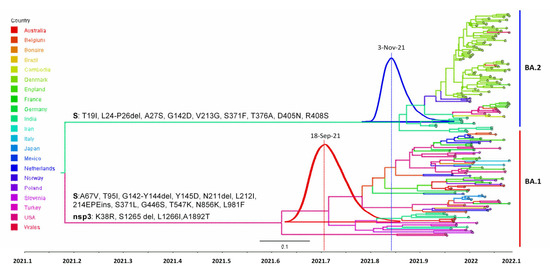 APA StyleKumar, N., Kaushik, R., Singh, A., Uversky, V. N., Zhang, K. Y. J., Sahu, U., Bhatia, S., & Sanyal, A. (2022). Bayesian Molecular Dating Analyses Combined with Mutational Profiling Suggest an Independent Origin and Evolution of SARS-CoV-2 Omicron BA.1 and BA.2 Sub-Lineages. Viruses, 14(12), 2764. https://doi.org/10.3390/v14122764