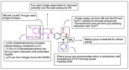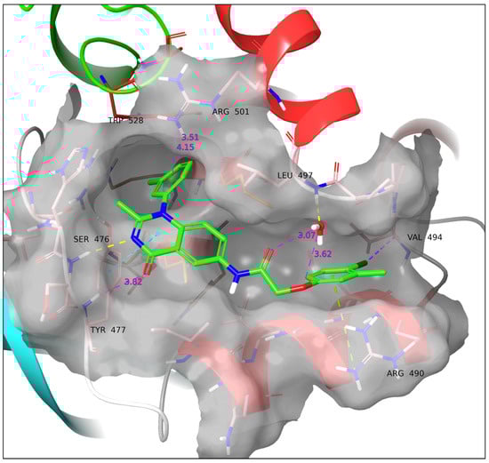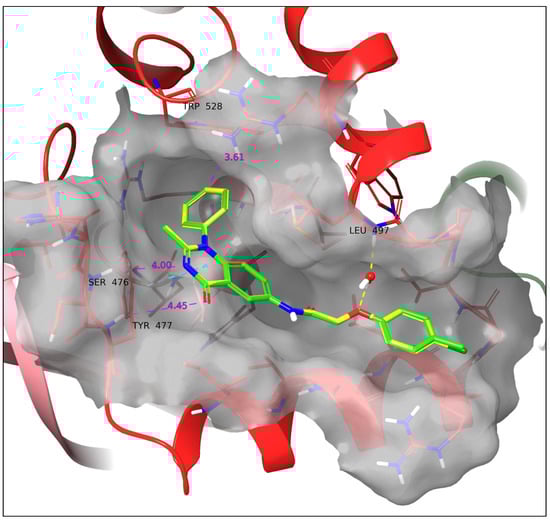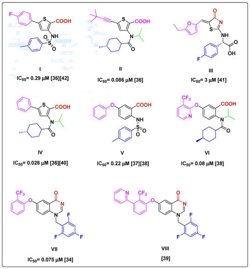 Studying these crystal structures revealed that most of the above NNIs have the same conformational patterns and binding interactions with the NS5B TP-2 allosteric site. Two direct or water-mediated hydrogen bonds between the inhibitor molecules and backbone NHs of Ser476 and Tyr477 were observed. Furthermore, the inhibitor’s hydrophobic moieties bind with two hydrophobic pockets of the enzyme via stacking with the side chain of Leu419, Met423, Leu497, and Trp528 [34,35,36]. Recently reported NS5B TP-2 inhibitors possessing micromolar inhibition potency in both enzymatic and cell-based replicon assays are depicted in Figure 1 and Table 1, respectively [34,36,37,38,39,40,41,42].