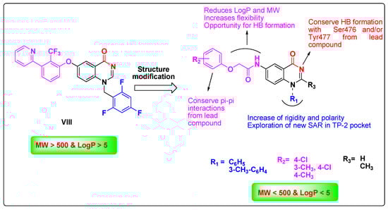 All lead structures share similar motif features and properties required for successful binding to the TP-2 allosteric site despite bearing different pharmacophoric elements. Specifically, motifs in red provide a dual HB formation between substrates and protein residues Ser476/Tyr477 (Figure 1). These key interactions are reported to be satisfied equally by the carboxylate (i.e., compounds I, II, IV, V, and VI), thiazolone (i.e., compound III), and quinazolinone (i.e., compound VII and VIII) moieties. Aryl substituents in blue (Figure 1) are well occupied in a deep hydrophobic pocket stacking with the side chain of Leu419, Arg422, and Trp528. The N-isopropyl group in green (Figure 1) in compounds II, IV, and VI points to the solvent and keeps the orientation of the cyclohexyl amide moiety toward the deep lipophilic pocket. In the rest of the molecules, the left-hand-side moieties in pink also make contact with the left-hand hydrophobic pocket of TP-2, stacking with the side chain of Leu497 and Ilu482. However, these lead compounds exhibit many drawbacks. Compound III has low potency in enzymatic assays (IC50 = 3 μm) [41]. Furthermore, compound V showed no cellular potency during an HCV subgenomic replicon assay (EC50 > 30 μm) [37]. Although compounds I, II, VI, VII, and VIII exhibited potent in vitro anti-HCV activity in both enzymatic and subgenomic cell replicon assays, they showed high lipophilic character (Table 1). Moreover, even though NS5B polymerase inhibitors exhibit broad activity against HCV genotypes, they have a low genetic barrier to resistance [29,43,44].